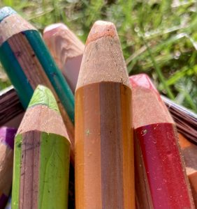 Wir gehen hinaus ans Ufer, auf die Wiesen oder an den Steg. Mit gefundenen Stöckchen, die wir in Tusche tauchen oder mit Kohle und Pastell fangen wir die Landschaft und ihre Bewegung ein.